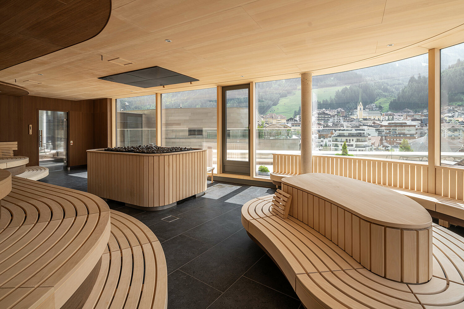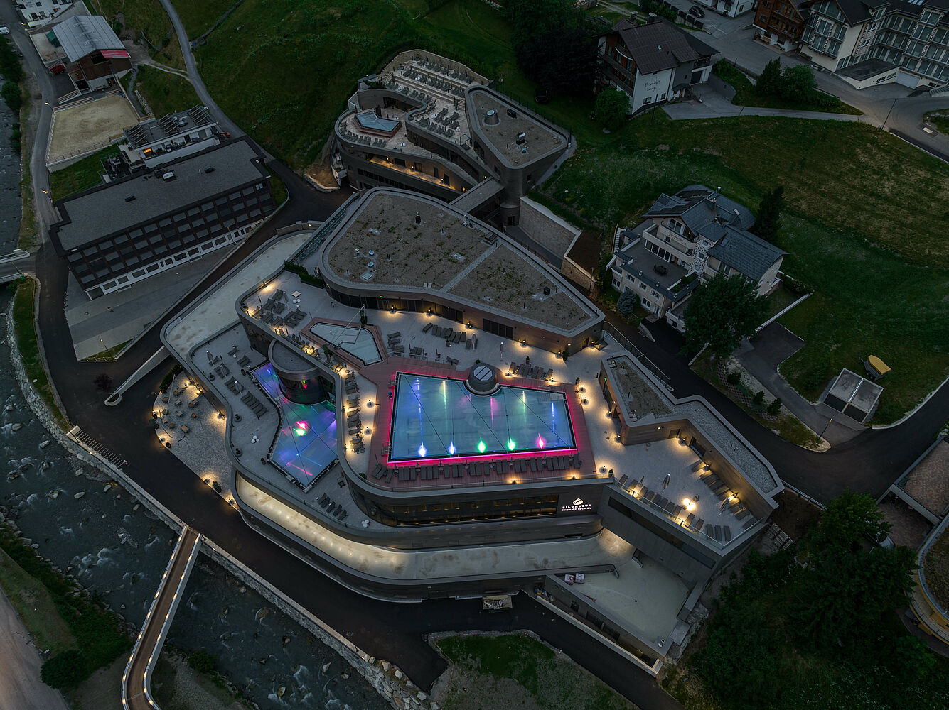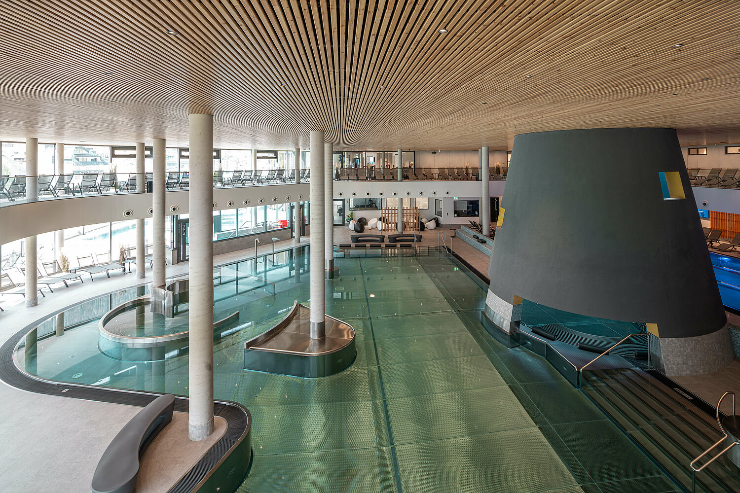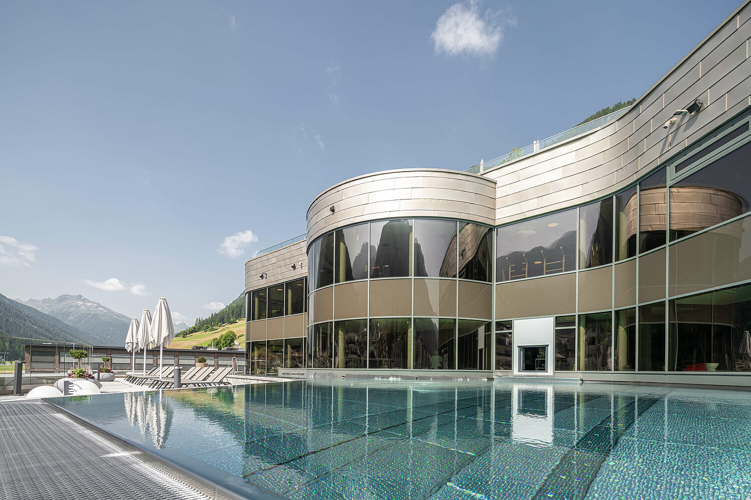 Die kunstvolle Form der Therme schmiegt sich perfekt in die umgebende Landschaft. Architektonisches Highlight des Gebäudes ist die champagnerfarbene Außenfassade, die das elegante Erscheinungsbild unterstreicht und deren Wechselwirkung mit der Umgebung sich im Laufe der Jahreszeiten verändert. Im Inneren der Therme liegt der Fokus auf dem Element Wasser in seinen drei Aggregatzuständen – Eis, Wasser und Dampf. In zwei Gebäuden erstreckt sich auf vier Stockwerken ein facettenreiches Angebot für Einheimische und Gäste.