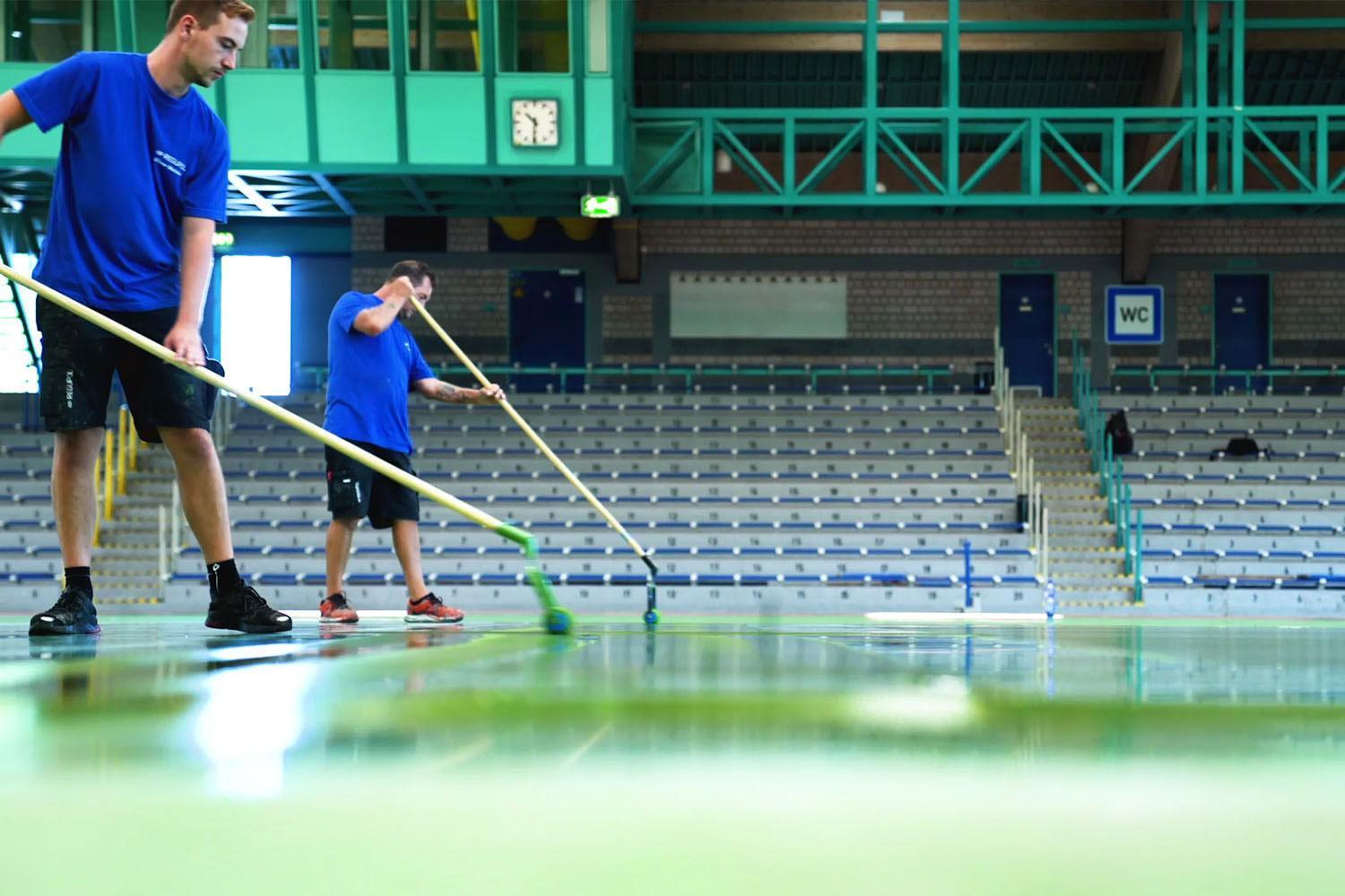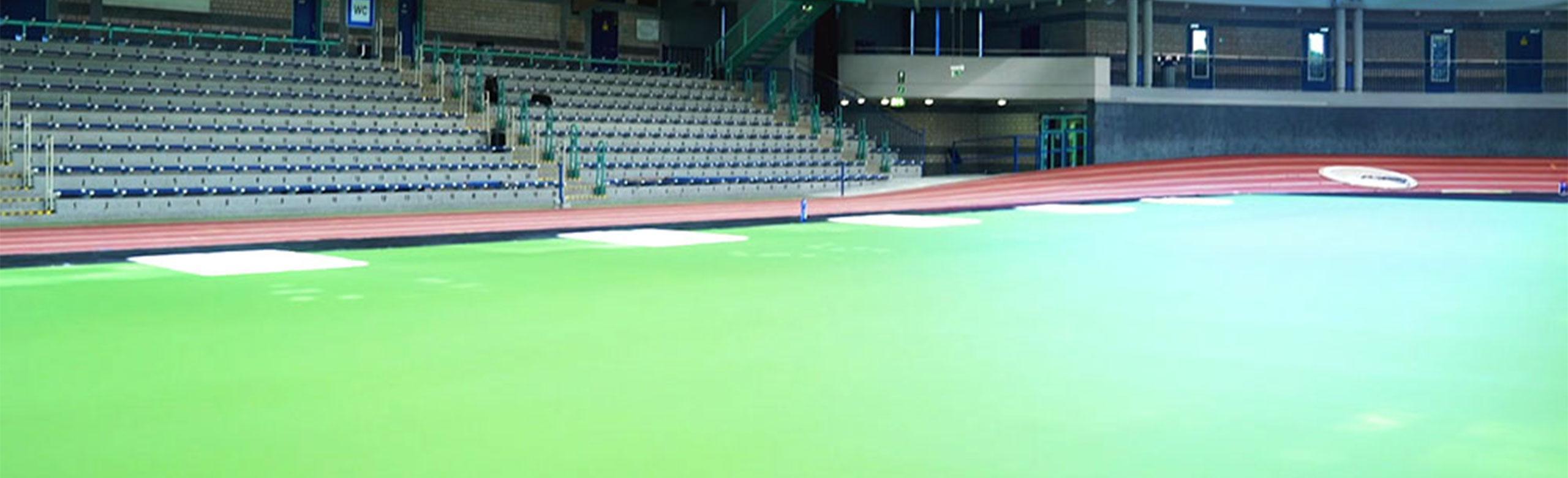 Hier kam nun REGUPOL dynamic SR zum Zuge. Dieses innovative Sportbodensystem von REGUPOL hat alle benötigten Eigenschaften eines regulären Sporthallenbelages, ist punktelastisch, weist einen hohen Kraftabbau auf, ist fugenlos, hat eine ebene und für Ballspiele sowie für Bodengymnastik gleichermaßen nutzbare glatte Oberfläche, ist aber durch die besondere Polyurethan-Oberbeschichtung gleichzeitig spikefest im Sinne der DIN EN 18 035. So können sowohl die herkömmlichen Schulsport-Aktivitäten durchgeführt, als auch die 60 m Sprints über den Sporthallenbelag problemlos trainiert werden. Des Weiteren müssen die Nutzer der 200 m Laufbahn keine Bedenken haben, den Sporthallenbodenbelag beim Betreten zu beschädigen.