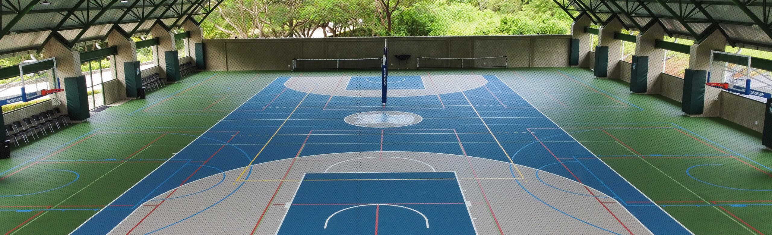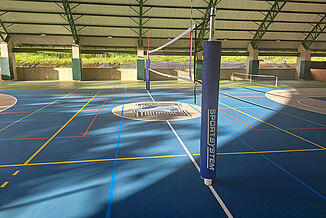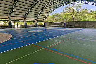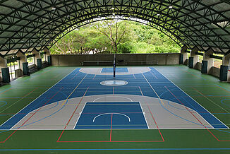Um die nachhaltigen Kriterien auch im Sportbereich zu verankern, setzte die La Paz School auf REGUPOL. In Mittel- und Südamerika ist es üblich, dass Sporthallen „halboffen“ gebaut werden. Dies bedeutet, dass oft keine durchgängigen Außenwände vorhanden sind, sondern stattdessen das Dach weit überragt. Trotzdem kann aber bei extremen Wetterbedingungen Feuchtigkeit auf den Boden einwirken. Hier kamen 1.062m² unseres Bodensystems REGUPOL dynamic classic 8+2 zum Einsatz, da dieses Material – im Gegensatz zu Holz, PVC, Linoleum o. Ä. – witterungsbeständig ist. Des Weiteren zeichnet sich der Boden durch viele Vorteile aus: er ist sehr langlebig, rutschsicher, hat eine hohe Schutzfunktion für die Sportler und ein gutes Ballrücksprungverhalten. Durch die fugenlose Polyurethan Nutzschicht ist der Boden extrem leicht zu reinigen und zu pflegen.