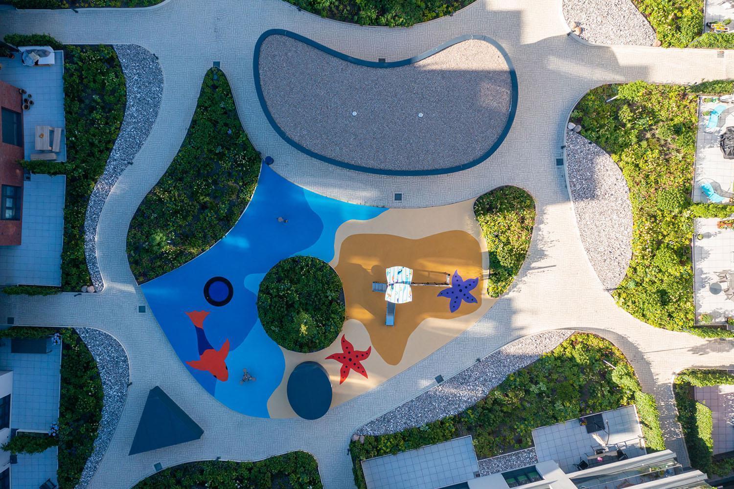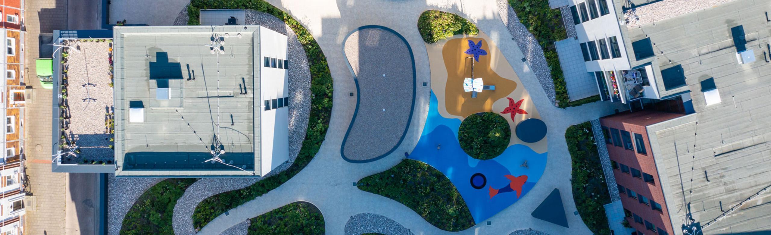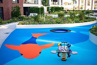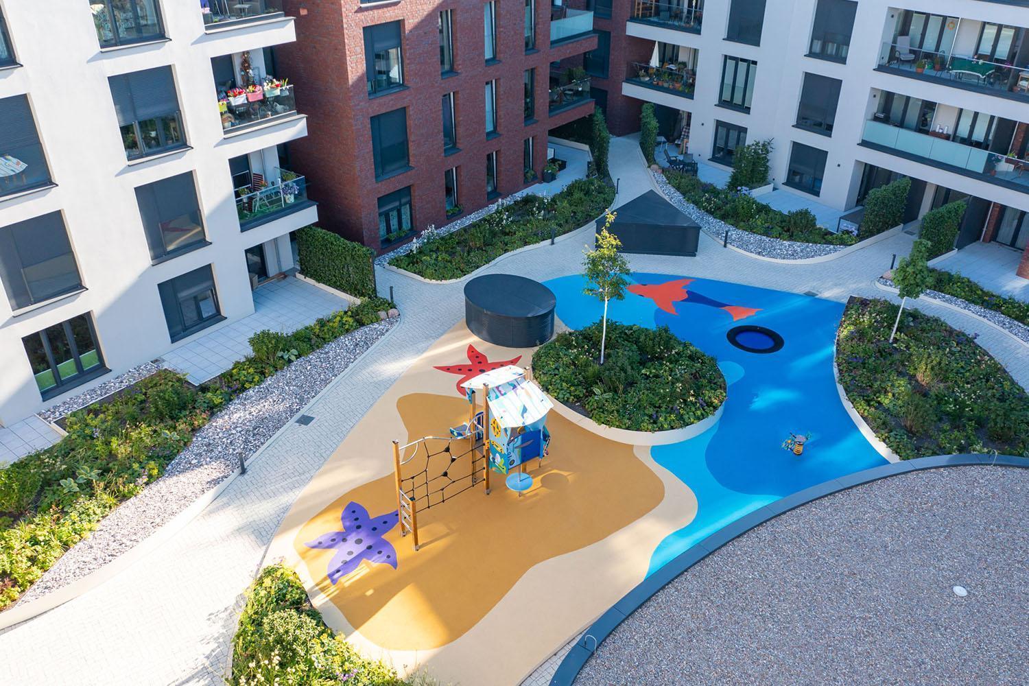 In dicht bebauten Städten existiert oft wenig Raum für Spielbereiche. Damit sich aber auch die kleinen Bewohner*innen im Quartier A11 im Hansehof wohl fühlen, wurde die innenliegende Fläche zwischen der Wohnraumbebauung für den Bau eines fantasievollen Spielplatzes genutzt. Schnell erreichbar für die Bewohner*innen mit ihren Kindern. Das Besondere an diesem Spielplatz ist, dass er auf unterbautem Raum direkt über der Tiefgarage des Quartiers liegt.