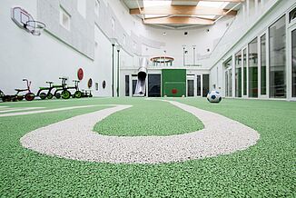 Wie die Alternative zum Abriss einer profanierten Kirche aussehen kann, zeigt sich am Beispiel der Kirche St. Sebastian in Münster. Hier wandelten die Architekten BOLLES+WILSON das ehemalige Gotteshaus in eine Kindertagesstätte um. Für die Sicherheit der Kinder beim Spielen in dem neuen Innen-/Außen „Spielzimmer“ sorgt der fugenlose Fallschutzboden REGUPOL playfix fun.