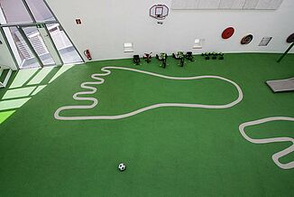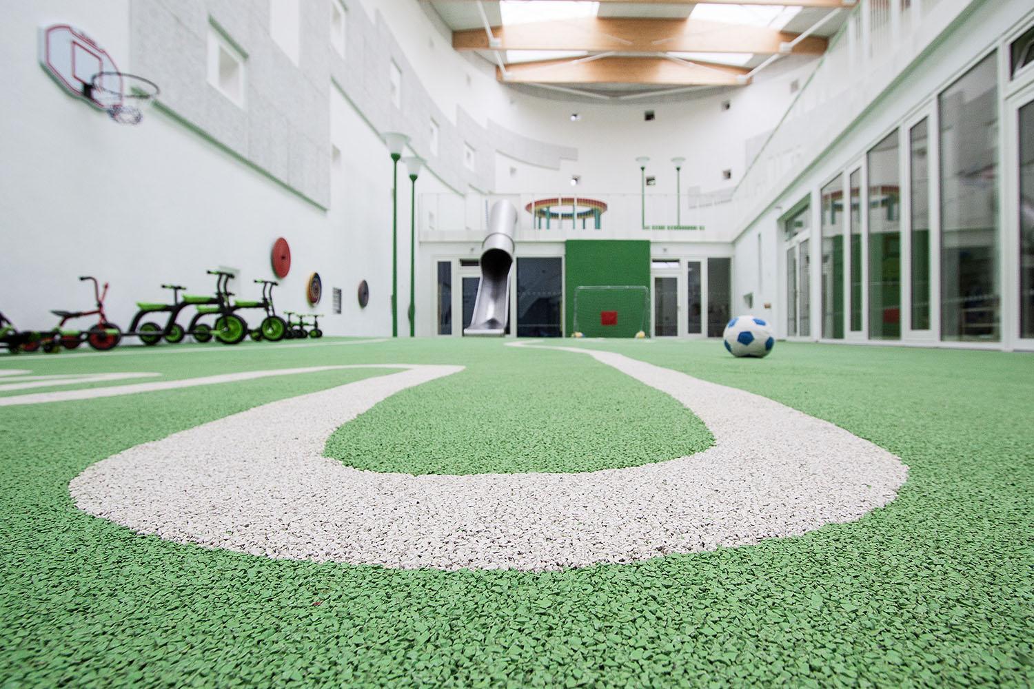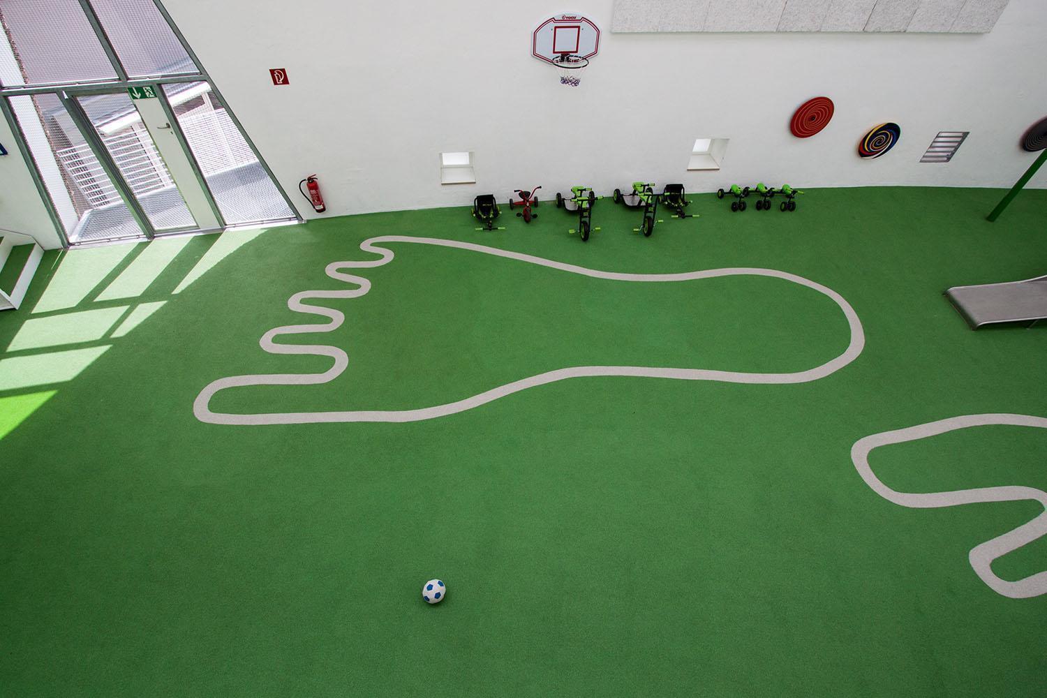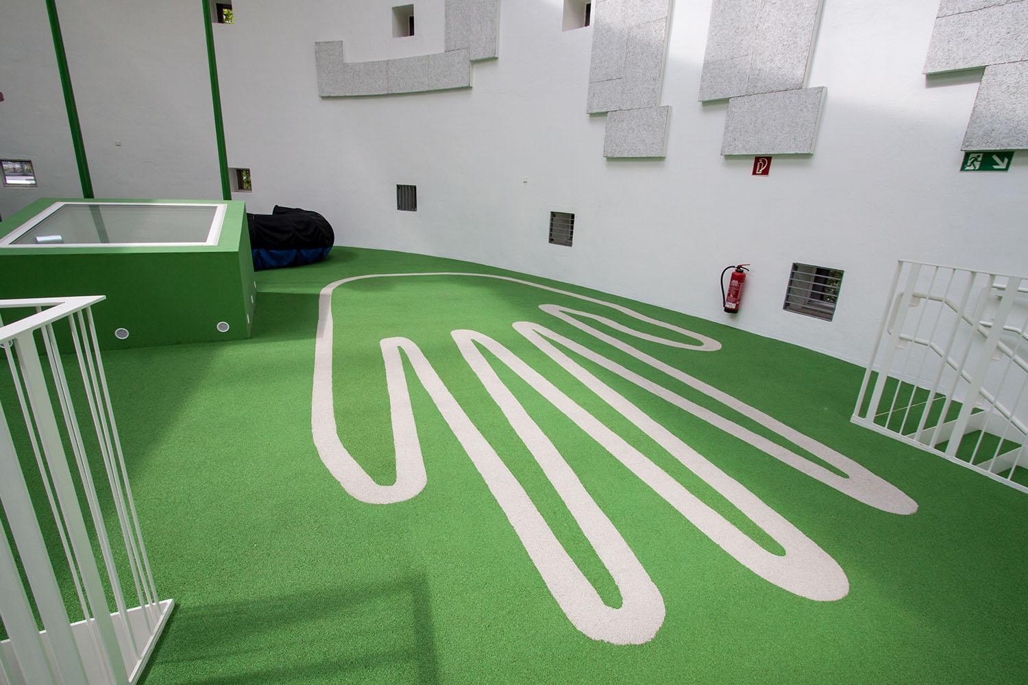 „Grasgrüner Fallschutzboden erweitert das Grün-auf-Grün-Konzept des Innenraums auf das ‚Spielzimmer‘. Gigantische Hand- und Fußabdrücke, eingelassen in den grünen Boden, erzeugen ein Spiel mit Maßstäben“, so BOLLES+WILSON über den Fallschutzboden REGUPOL playfix fun von REGUPOL. In der Kirche St. Sebastian besteht er aus einem zweischichtigen Aufbau mit einer 30 mm dicken Basisschicht, die für die Fallschutzeigenschaften sorgt und einer 10 mm dicken Nutzschicht aus farbigen EPDM-Granulaten. Bei der Gesamtdicke von 40 mm beträgt die maximale Fallhöhe 1,50 m gemessen nach DIN EN 1177:2008. Der Fallschutzboden hat eine brandsichere Ausrüstung, um die Anforderungen der Brandschutzklasse B1 zu erfüllen.