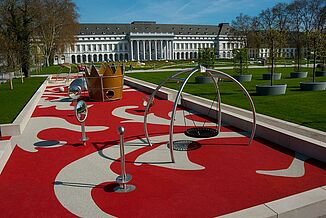 Der rechteckig angelegte Spielplatz liegt ca. 10 bis 15 cm tiefer als die angrenzenden Wegeflächen. 450 Quadratmeter der Spiel und Bewegungsfläche wurden mit dem fugenlosen Fallschutzboden REGUPOL playfix fun von REGUPOL ausgestattet. Die Grundfläche sowie die Intarsien im Barockstil bestehen jeweils aus einer Mischung von zwei Granulatfarben. „Die majestätischen Muster sowie die dezente Farbgebung der Spielgeräte spiegeln das Gestaltungskonzept optimal wider“, so Czerniejewski, „Außerdem geben die farbigen Muster einen zusätzlichen Spielwert.“