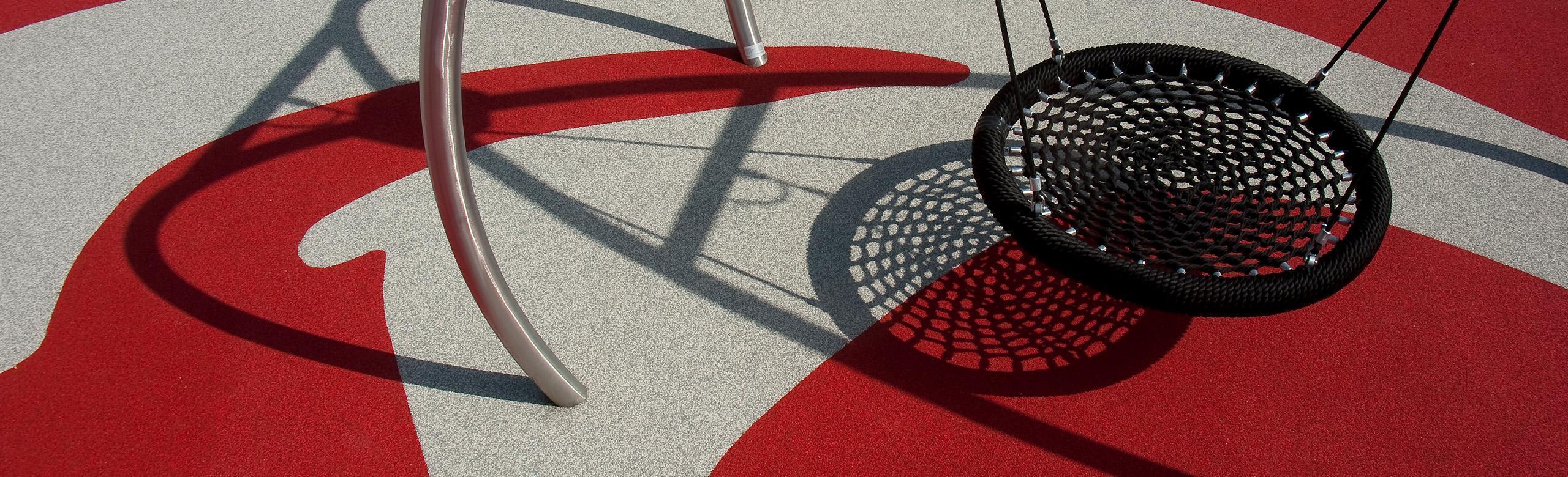 Deswegen wollte der Landschaftsarchitekt unbedingt mit einem Material arbeiten, das durch seine Beschaffenheit und Einbauweise eine mehrfarbige Gestaltung erlaubt. Mit REGUPOL playfix fun fand er es. Der zweischichtige Aufbau garantiert die geforderten Fallschutzwerte, die farbige Nutzschicht setzt kreativen Gestaltungsideen keine Grenzen. Die integrierten Spielgeräte werden von REGUPOL playfix fun nahtlos umschlossen. So entstand ein kindgerechter Erlebnisraum, der barrierefrei zugänglich ist. Auch bei der Wahl der Spielgeräte wurde auf die Möglichkeit zur Integration behinderter Kinder geachtet. Viele der Geräte sind Sonderanfertigungen aus Edelstahl, bei deren Design besonders auf Blickdurchlässigkeit geachtet wurde. „Aufgrund des historischen Umfelds, haben wir großen Wert auf die Transparenz der Spielgeräte gelegt“, so der Landschaftsarchitekt.