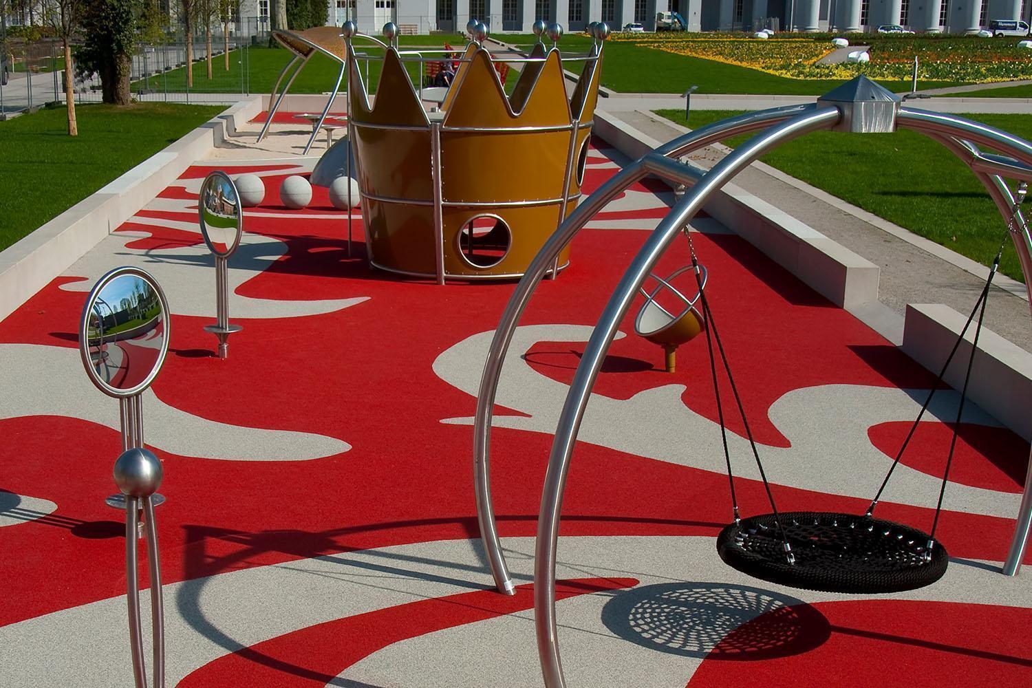 Deswegen wollte der Landschaftsarchitekt unbedingt mit einem Material arbeiten, das durch seine Beschaffenheit und Einbauweise eine mehrfarbige Gestaltung erlaubt. Mit REGUPOL playfix fun fand er es. Der zweischichtige Aufbau garantiert die geforderten Fallschutzwerte, die farbige Nutzschicht setzt kreativen Gestaltungsideen keine Grenzen. Die integrierten Spielgeräte werden von REGUPOL playfix fun nahtlos umschlossen. So entstand ein kindgerechter Erlebnisraum, der barrierefrei zugänglich ist. Auch bei der Wahl der Spielgeräte wurde auf die Möglichkeit zur Integration behinderter Kinder geachtet. Viele der Geräte sind Sonderanfertigungen aus Edelstahl, bei deren Design besonders auf Blickdurchlässigkeit geachtet wurde. „Aufgrund des historischen Umfelds, haben wir großen Wert auf die Transparenz der Spielgeräte gelegt“, so der Landschaftsarchitekt.