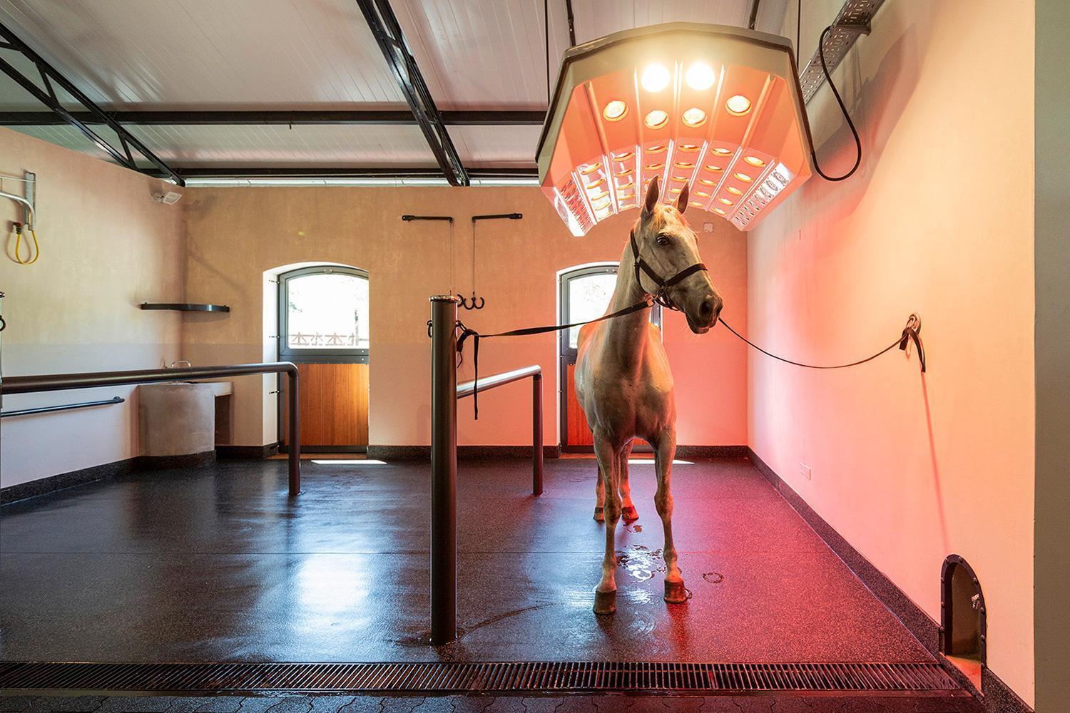 Für die tägliche Kontrolle und die erste tierärztliche Betreuung von Pferden wurde ein Veterinärbereich eingerichtet. Hier wurde ebenfalls die robuste und elastische REGUPOL Bahnenware für Wand und Boden gewählt. Der besondere Vorteil dieser Lösung: Sie ist durch die feste Verklebung eben und senkt damit das Verletzungsrisiko Ihrer Pferde.