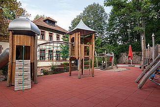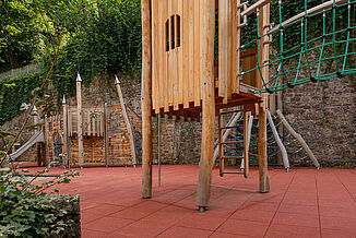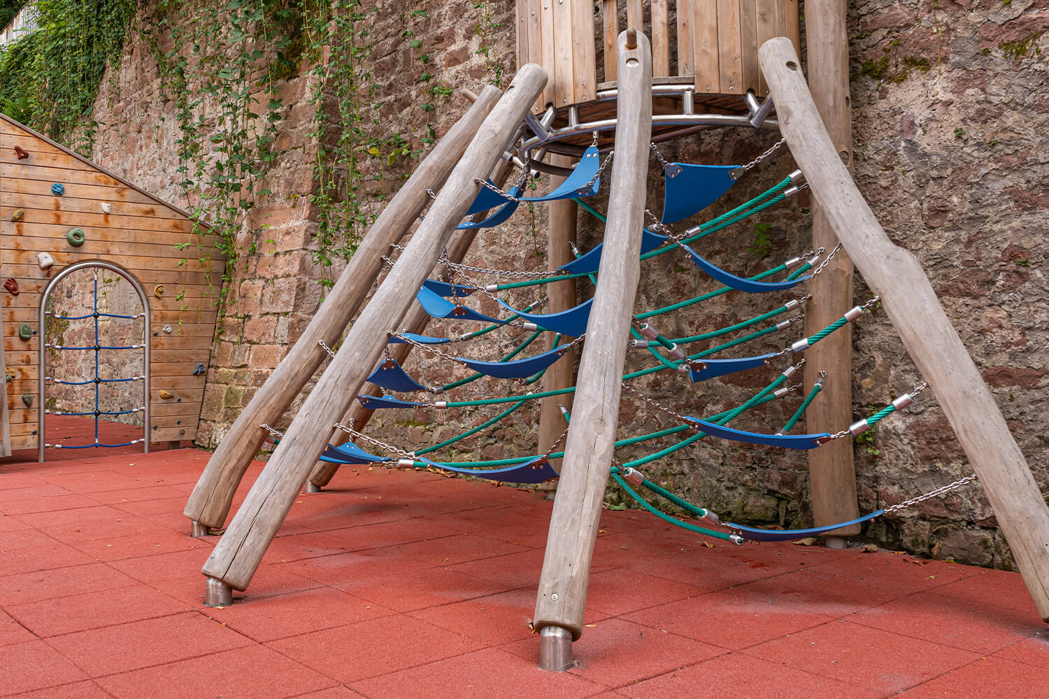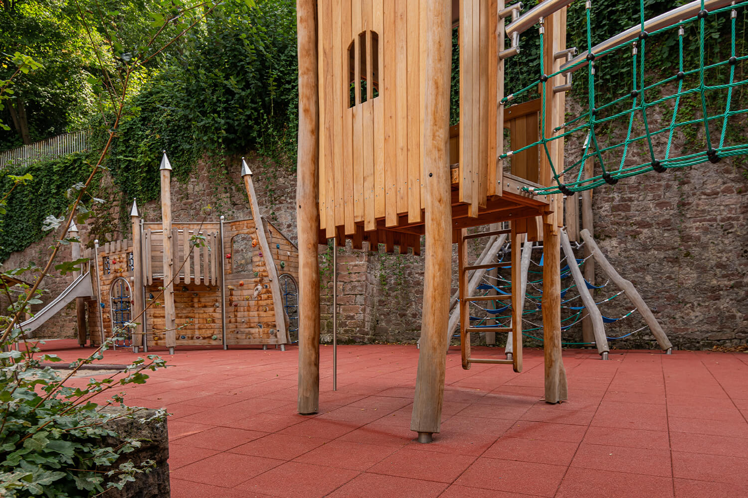 REGUPOL lieferte für dieses Projekt insgesamt 315 m² Fallschutzplatten REGUPOL playfix FX in Rot. Die nach DIN EN 1177 geprüften Platten wurden in zwei unterschiedlichen Stärken geliefert, um den verschiedenen Anforderungen des Spielplatzes gerecht zu werden: 110 mm starke Platten (für Fallhöhe bis 3 Metern) für Bereiche, in denen höhere Fallhöhen zu erwarten sind, und 75 mm starke Platten (für Fallhöhe bis 2,10 Metern) für Bereiche, in denen die Kinder eher bodennah spielen. Besonders bei aktiven Kindern, die viel Freude am Klettern und Springen haben, sind die Fallschutzplatten unverzichtbar. Sie sorgen dafür, dass mögliche Stürze sanft abgefangen werden und minimieren so das Verletzungsrisiko. So können die Kinder weiterhin hoch hinaus und sich ganz ihrem Spiel hingeben. Neben der funktionalen Sicherheit bietet das kräftige Rot der Platten ein optisches Highlight. Farben spielen eine wichtige Rolle in der kindlichen Entwicklung und tragen dazu bei, die Fantasie und Kreativität der Kinder zu fördern. Das lebendige Rot fügt sich perfekt in das Gesamtbild des Spielplatzes ein und sorgt für eine fröhliche und einladende Atmosphäre, die zum Spielen und Entdecken einlädt.