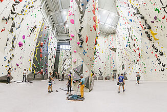 „In Madrid haben wir etwa 570 Quadratmeter unseres REGUPOL climb 77 in stone grey installiert“, erinnert sich Kai Mayer-Ullmann, Sales Associate in der Sports Division. „Im Außenbereich kamen zusätzlich rund 60 Quadratmeter REGUPOL climb fun in light grey hinzu.“ Beide Böden bestehen aus mehreren Aufbauschichten. Im Falle des Indoorbodens eine 75 Millimeter dicke Elastikschicht aus verschiedenen Verbundschäumen und eine rund zwei Millimeter dicke Nutzschicht aus Polyurethan. Sowohl der Innen- als auch der Außenbereich ist fugenlos, was die Reinigung enorm erleichtert. Durch den hohen Kraftabbau und gute Fallschutzeigenschaften mindert der Boden das Verletzungsrisiko nach einem Sturz und sorgt zusätzlich für einen festen Stand des Sicherungspartners am Boden.