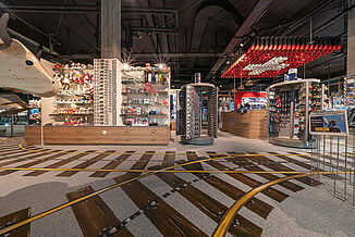 Ein optisches Highlight ist die Bodengestaltung im Top of Europe Shop: Auf dem grauen Bodenbelag hat ein Airbrushkünstler Schienen aufgesprüht. Die Herausforderung dabei war, eine verträgliche und haltbare Farbe zu finden.