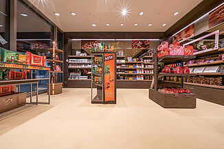Farblich ins Konzept passte der beigefarbene REGUPOL everroll alpine Bodenbelag im Lindt Shop. Dort harmoniert er gut mit dem Mobiliar und der dunklen Wandgestaltung. Der Lindt-Shop befindet sich in dem Terminal Grindelwald umgeben von weiteren Shops sowie den Zugängen zu den Seilbahnen. REGUPOL Bodenbeläge haben nicht nur optisch etwas drauf. Sie sind robust, trittschalldämmend und langlebig sowie stoß- und schlagfest.